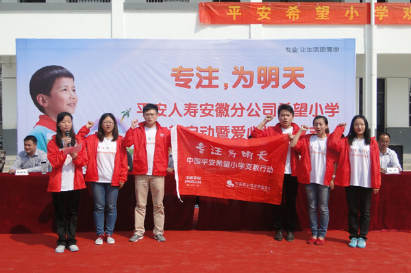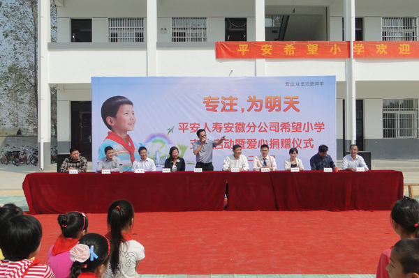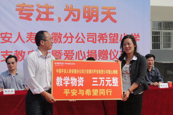 仪式上,平安保险公司向该校捐赠了3万元的教学设备。平安希望小学的小学生们以优美的舞姿向在场的叔叔、阿姨们表示衷心的感谢 。