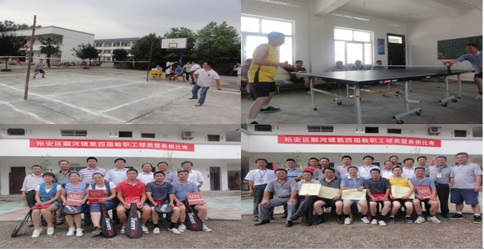 为了丰富校园文化生活、促进校际交流与精神文明建设,进一步推进教育系统健身运动的发展,全镇8所小学、2所初中和2所幼儿园共12支代表队,六十多名教职工踊跃报名参加顺河镇第四届教职工球类暨象棋比赛。简单的开幕式后,各项比赛正式开始。羽毛球赛场上,换上了轻便运动装的教职工变成了活力四射的运动员,尽显风采。比赛中,每位参赛选手充分发挥顽强拼搏的体育精神,即使落后,仍每球必争,决不轻易放弃,使比赛成为一次难得的现场观摩和学习的好机会。乒乓球比赛更是高潮迭起,直拍、横拍、扣球、旋转球、弧线球让人目不暇接,喝彩声、加油声、欢呼声此起彼伏,不绝于耳。经过紧张而又激烈的角逐,王胜利、张婷婷分别荣获男、女乒乓球单打冠军;鲍丙军、李跃分别荣获男、女羽毛球单打冠军;张承奎同志荣获本届象棋比赛冠军称号。