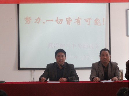 2013年4月25日下午,顺河初中成功召开了毕业班中考动员会。学校领导高度重视毕业班工作,精心准备了这场动员会。鲍丙军校长做了题为“努力,一切皆有可能”的动员讲话,杨道武主任专门对学生进行了临考前的心理疏导,陈尚德书记最后就学生冲刺阶段的学习方法做了详细阐述。