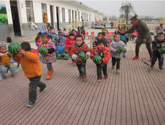 抱球比赛:温暖的阳光洒在跑道上,孩子们听到老师的口令后抱着小球争先恐后地奔跑。