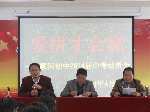 4月25日下午1:20,顺河初中在多媒体教室举行了以“爱拼才会赢”为主题的中考冲刺50天动员会。鲍丙军校长、陈尚德书记、杨道武主任、沈思赵主任及初三全体学生参加了动员会。 动员会由鲍校长主持。陈书记首先发言,他围绕冲刺阶段的学习方法,针对不同的学习层次,向全体毕业班学生做了细致的引导,并鼓励大家珍惜时间,制定目标,树立信心,查漏补缺、打好中考攻坚战,收获六月的辉煌。杨道武主任就冲刺阶段学生应如何调整心态深入浅出地作了分析。