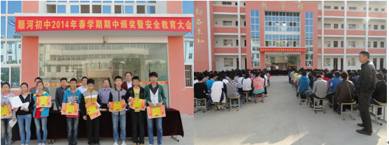 2014年5月15日上午,顺河初中召开了“2014年春学期期中颁奖暨安全教育大会”。