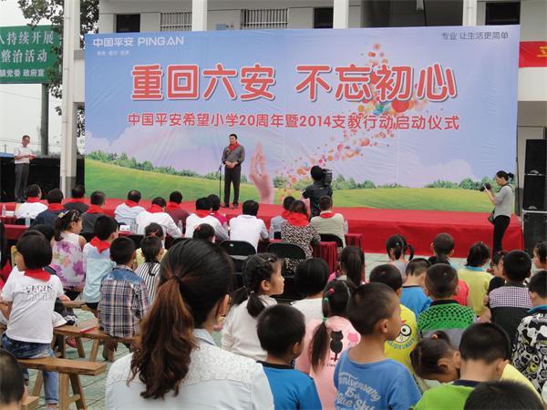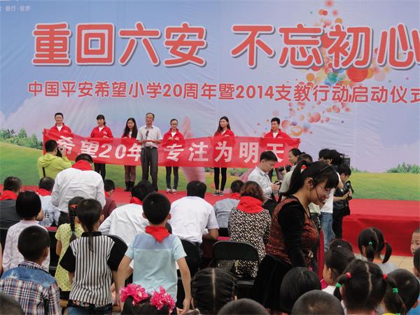 启动仪式上,丁当回顾了中国平安希望小学20年来的发展历程,指出到目前为止,平安已在全国捐建了111所平安希望小学。自建校以来,平安保险一直关注学校的发展,除每年提供两万元的物资支持外,每年还为每所平安希望小学25名孩子每人提供500元的奖学金;每年派四批支教老师来到全国各地平安希望小学开展支教活动。平安保险除了为学校提供物质上的帮助,还为学校校长、老师提供专业培训。他表示,中国平安将一如既往地秉承博爱、友善、互助、奉献的企业文化和精神践行企业社会责任,热心公益,回馈社会。今天,平安人寿保险公司向中国青基会现场捐赠200万元。