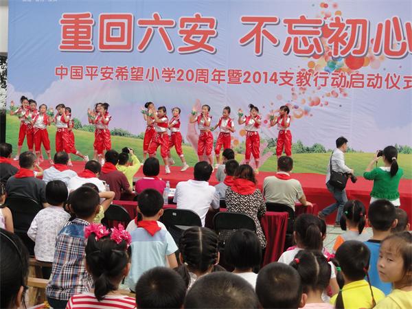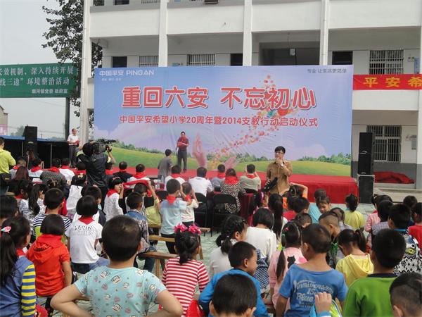 9月16日上午,顺河镇平安希望小学隆重举办建校20周年庆祝活动暨“重回六安·不忘初心”中国平安保险2014支教行动启动仪式。中国青少年发展基金会副秘书长王旭东、中国平安人寿保险股份有限公司董事长兼CEO丁当、裕安区委常委、副区长吴文斌等到场参加活动并发表了重要讲话。裕安区团委、区教育局有关负责人也参加了庆典活动。