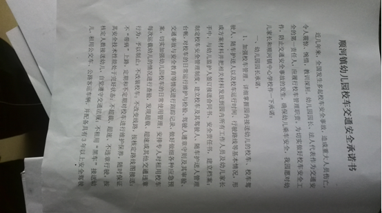 《承诺书》对幼儿园配用的”校车”、 “校车”驾驶、常规管理等的使用都提出了具体要求。检查人员当场要求幼儿园负责人签订《承诺书》,一式两份,一份学校留存,进一步明确了幼儿园的义务、职责。(王成)