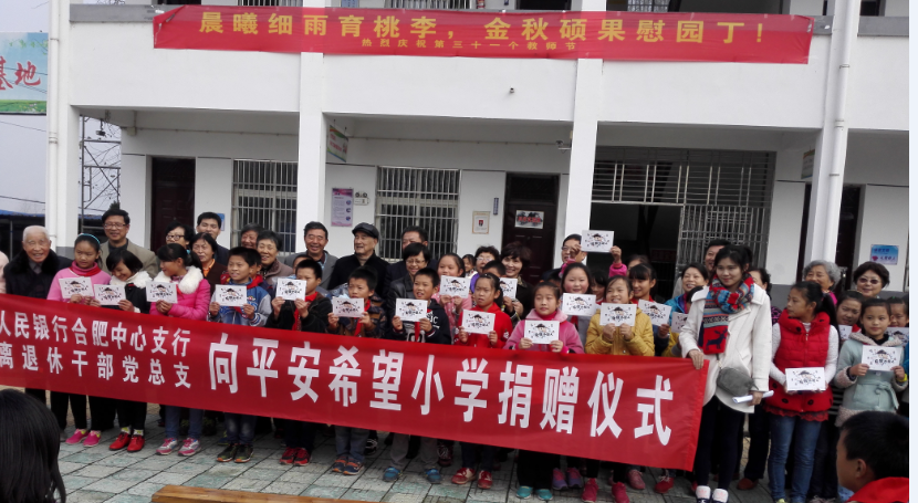 捐赠仪式上,省城金融系统离退休老干部们亲手把书包、文具、围巾等学习和生活用品发放给贫困留守儿童,并且亲切合影留念。他们的爱心赢得了一阵阵热烈的掌声。程正义同志代表顺河镇党委、政府以及平安希望小学全体师生,感谢省城金融系统离退休老干部们慷慨捐赠,希望孩子们志存高远,严谨笃学,积极进取,励志成才,用实际行动报效祖国,回报社会,让爱心薪尽火传。