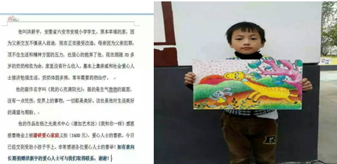 顺河镇安城村是桂景慧的老家,在今年春天回乡送教中,她得知洪新宇同学家庭非常困难,父亲因误入歧途正在改造,母亲已改嫁,他和70多岁多病的祖母寄宿在姑姑家,但他对学习、对生活一样有着美好的渴望和追求。桂景慧主任携手上海德加艺术坊慈善机构拍卖洪新宇同学的“我的心充满阳光”儿童画,最后以1600元人民币拍卖。