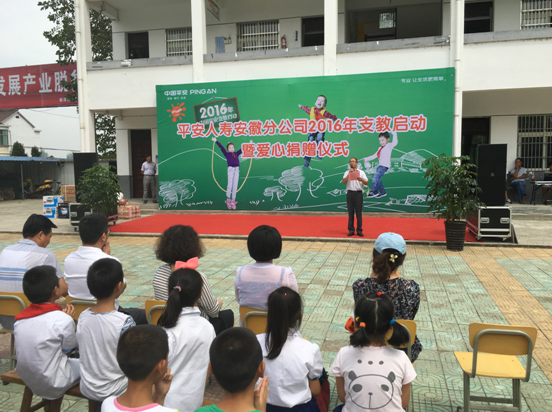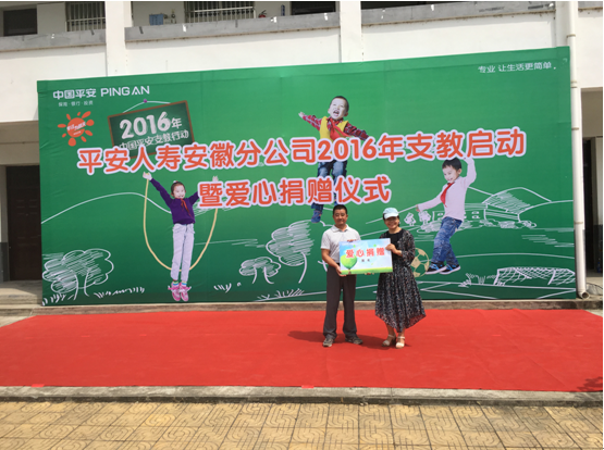 9月5日上午,平安保险2016年支教活动在顺河镇平安希望小学正式启动了,平安人寿保险公司安徽分公司主任史斌、副主任马晓彤及平安保险公司的爱心客户魏琳、陈珍霞女士在镇中心校领导的陪同下,来到平安希望小学开展爱心捐助活动。这是平安保险有限公司安徽分公司自2008年开始的第九次“专注为明天”支教暨爱心捐赠活动。