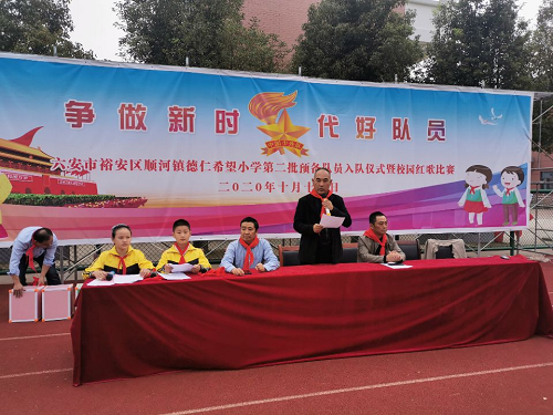 为庆祝中华人民共和国成立71周年,纪念少先队建队71周年,教育引导广大少先队员听党话、跟党走,用实际行动把红色基因一代代传下去,增强少先队员光荣感,10月13日上午,顺河镇德仁希望小学举办了“争做新时代好队员 ”第二批预备队员入队仪式暨校园红歌比赛活动。